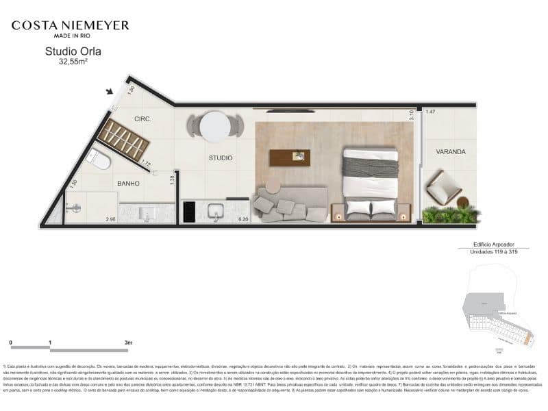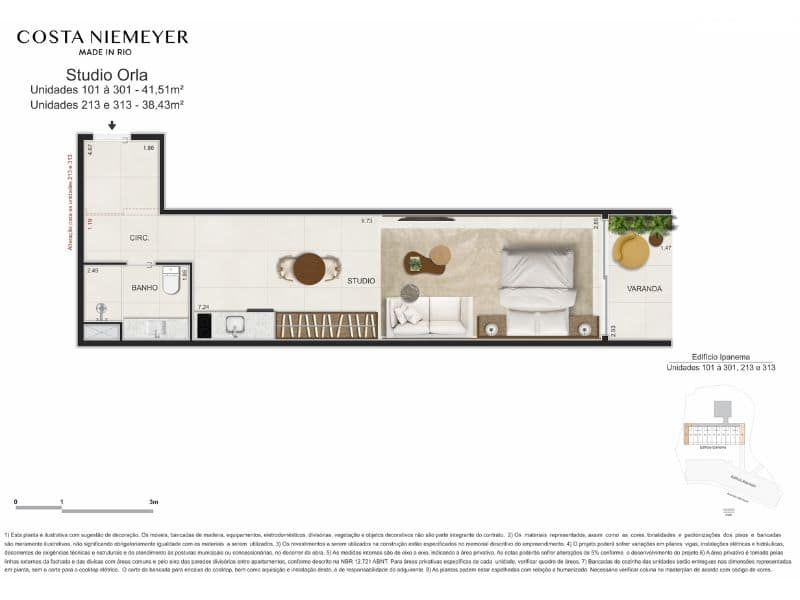 - Metragem: Varia entre 33 m² e 45 m² (aproximadamente).