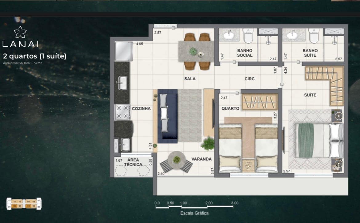 • Tipologias: * 2 Quartos: Unidades Tipo de 52 m² e Gardens de 70 m².