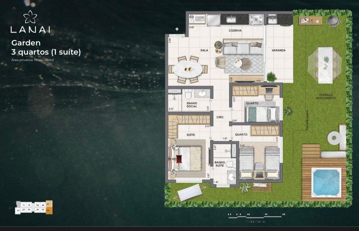 O Lanai oferece apartamentos de 2 e 3 quartos com suíte, incluindo unidades Tipo e unidades Garden (térreos com terraço privativo). As metragens variam de aproximadamente 52 m² (2 quartos) a 116 m² (unidades Garden maiores).